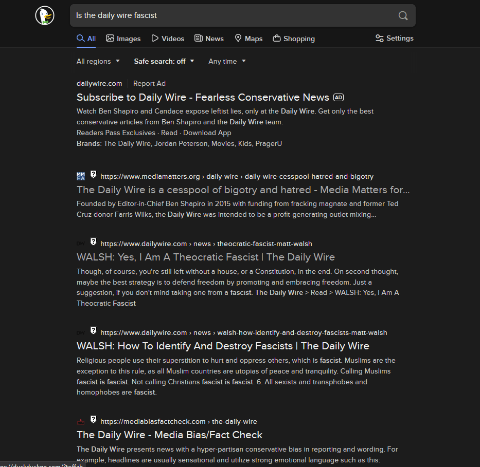 So I did a search “Is the Daily Wire fascist” and the first non-ad result, Media Matters (www.mediamatters.org). Well this does not bode well as they are fundamentally biased against conservative media. Now this does not mean we ignore them outright; it means that we need to take what they say with a HUGE grain of salt in their opinions of conservative media. The next article was from the Daily Wire itself, and from Matt Walsh confirming he is a “Theocratic Fascist”. The amount of sarcasm in that article (not behind a paywall [ https://www.dailywire.com/news/theocratic-fascist-matt-walsh ]) is enough that I need hip-waders just to finish it.